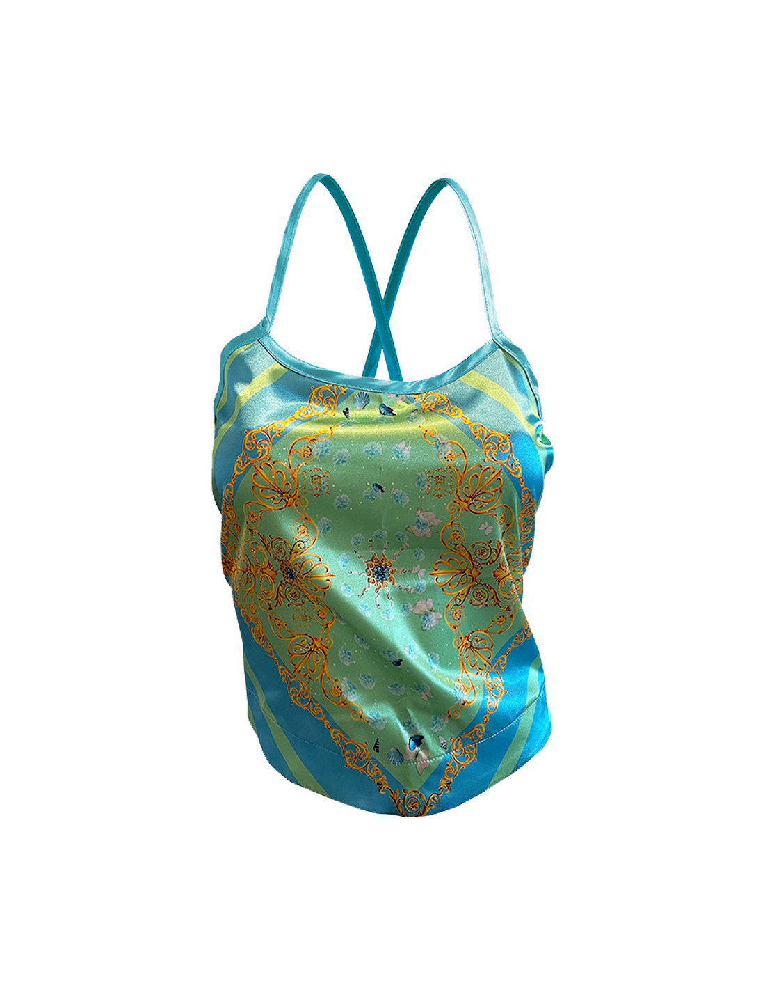 Un giardino marino sospeso in menta e azzurro. Conchiglie lucenti, gemme disperse, frammenti preziosi che sembrano fluttuare sotto una superficie immobile. Intorno, il barocco si arrotola in volute d’oro acceso, teatrale e leggermente fuori scala, come un ornamento che ha dimenticato la sua funzione. Sembra silenzioso, ma sta cantando sottovoce.
